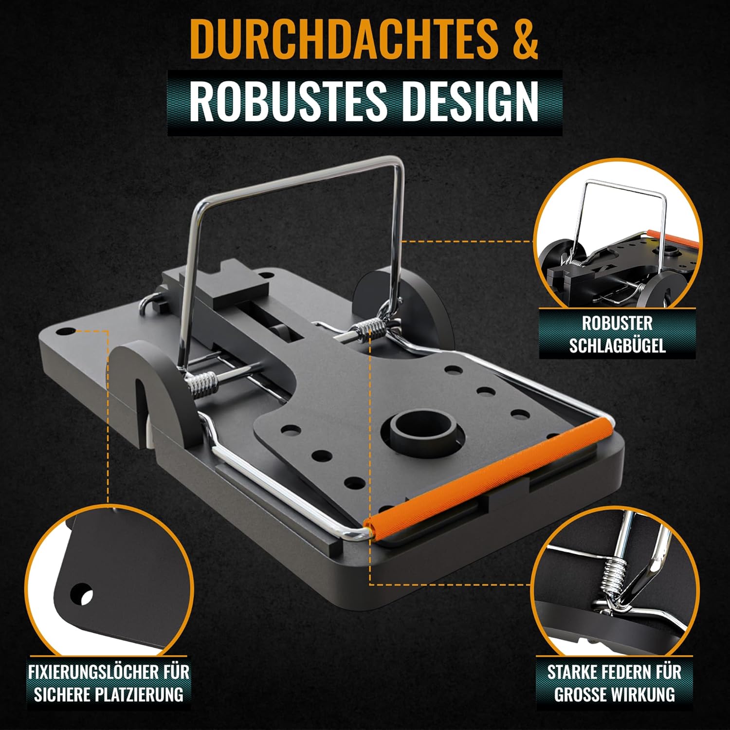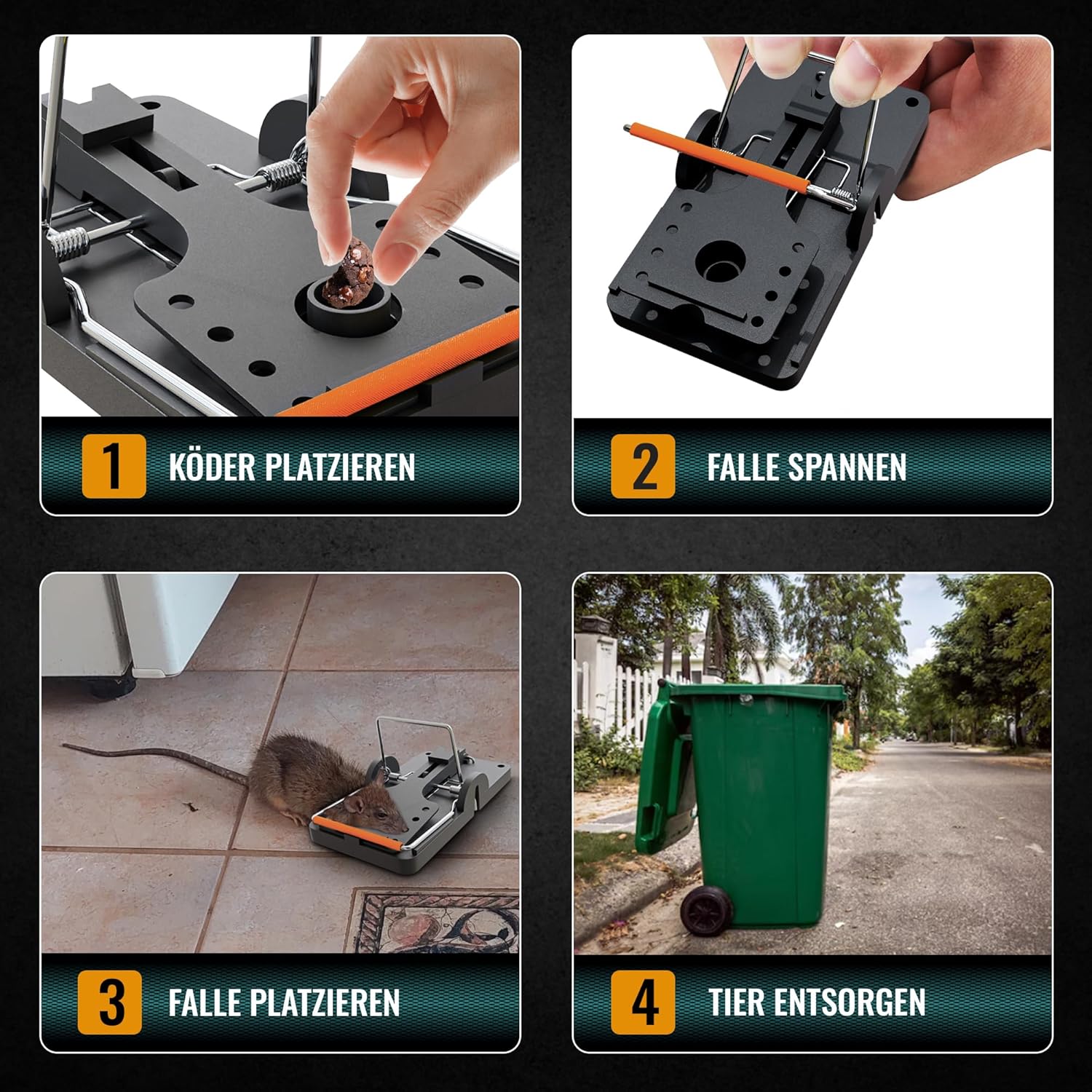 Die Schlagfallen sind mit einem empfindlichen Auslösemechanismus und verstärkten Stahlfedern ausgestattet. Sobald die Ratte den Köder berührt, löst die Falle sofort aus. Das sorgt für eine hohe Fangrate und eine schnelle, effektive Wirkung.