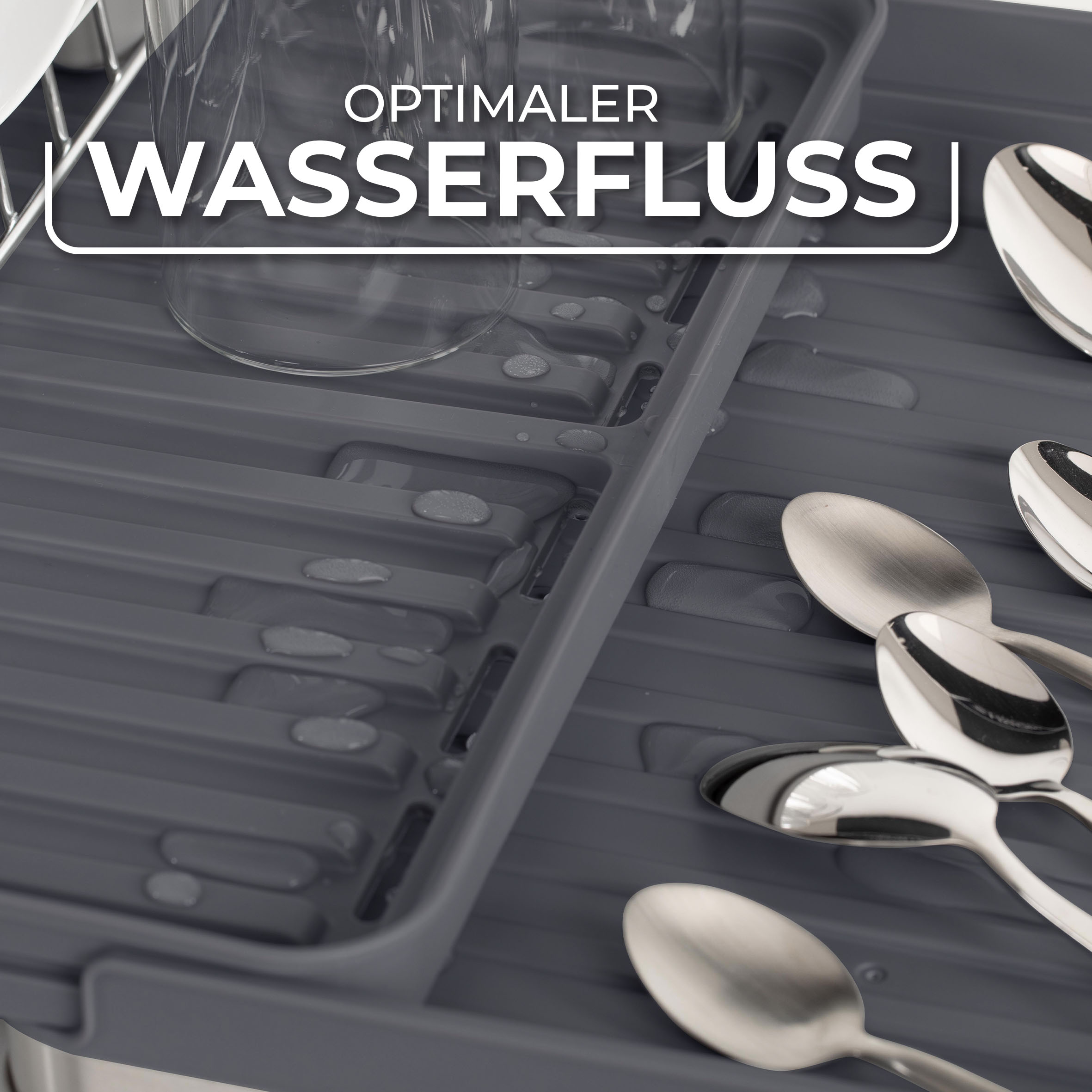 Dank der cleveren Konstruktion bleibt alles geordnet, sauber und frei von Wasserflecken – ganz ohne lästiges Abtrocknen. Durch die geneigte Schale mit integrierter Wasserableitung fließt überschüssiges Wasser direkt in die Spüle, sodass keine Staunässe oder Pfützen auf der Arbeitsplatte entstehen.