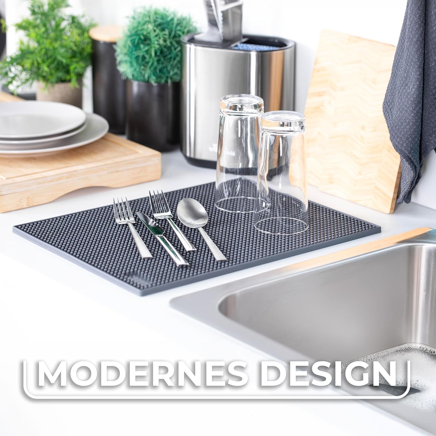 Das TPR-Material ist wasserabweisend, geruchsneutral und lässt sich bei Bedarf einfach in der Spülmaschine reinigen. Anders als Mikrofaser-Abtropfmatten nimmt die Matte kein Wasser auf und trocknet nach dem Abwischen sofort.