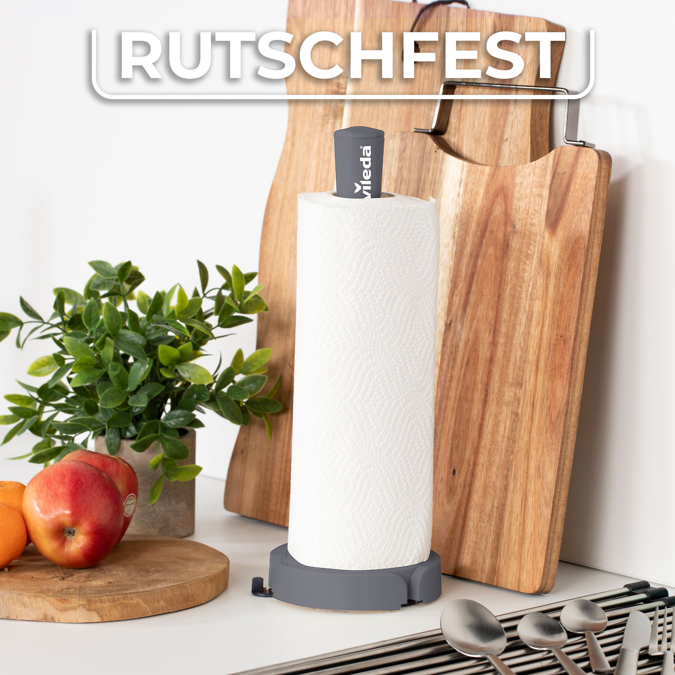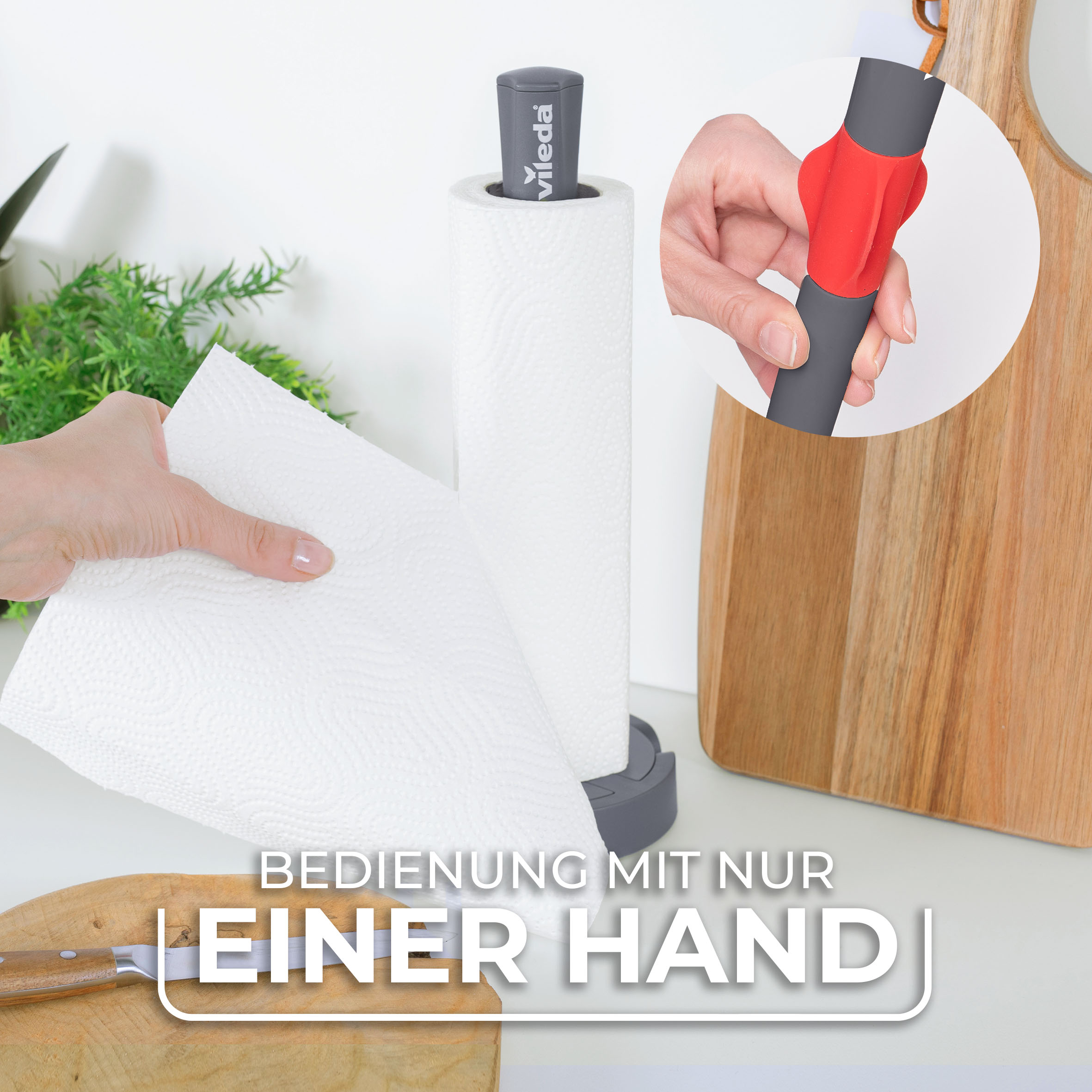 Mit dem integrierten Rollenstopper lässt sich das Küchenpapier leicht abreißen – einfach, sauber und mit einer Hand. Damit ist der Vileda Küchenrollenhalter der ideale Helfer beim Kochen, Putzen und Aufräumen, wenn es schnell gehen muss.